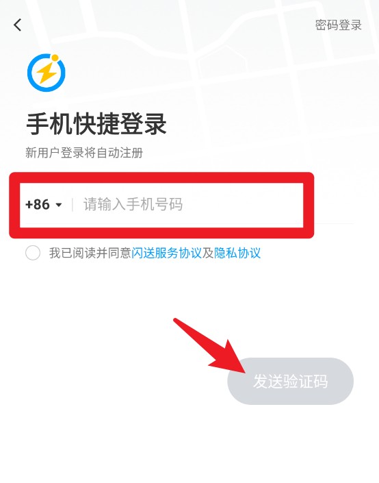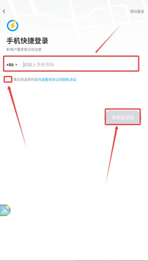 1、打开闪送APP,首次登录需输入手机号码并勾选协议,点击发送验证码完成快速注册。