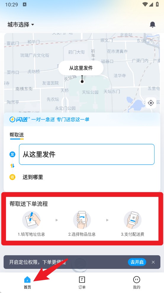 3、首页点击“帮我送”功能,选择地址和物品,即可开启专属一对一急送服务。