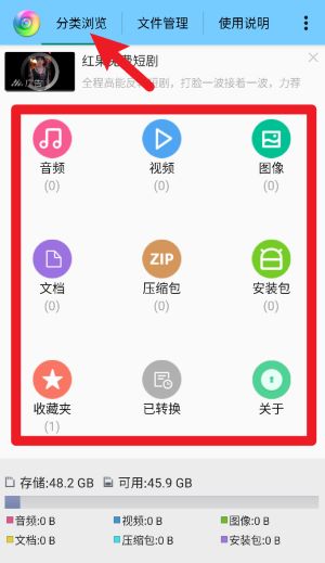 1、点击“分类浏览”页面即可快速进入音频、视频、图像等常见格式分类区域,方便用户快速定位文件类型。