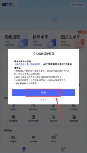 1、请先阅读并确认同意用户协议,之后即可进入软件主界面继续操作。