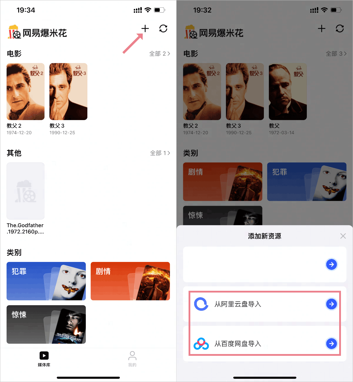 1、打开网易爆米花app官方版进入首页点击右上角的【+】图标,并选择需要添加的网盘(从阿里云盘导入、从百度网盘导入、从中国移动云盘导入)