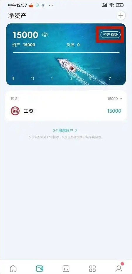 第一步:打开薄荷记账,找到绑定的银行卡,点击资产趋势进入。