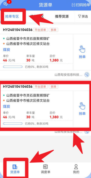 1、在货源单页面,用户可进入抢单专区,系统会展示详细的货源信息,包括单价、数量和总价,用户核对无误后可直接点击抢单按钮,快速锁定运输任务。