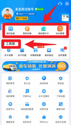 3、在个人中心页面,用户可以管理个人资料、车辆和银行卡信息,并通过工具箱完成身份验证、证件更新和车辆排放量管理,确保账号和车辆资料完整无误。
