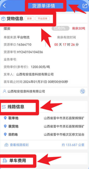2、在货源单详情界面,用户能够查看货物信息、线路信息及单车费用,清楚掌握起点、装货地和目的地的路线安排,同时还能确认装车时间,合理规划行程。
