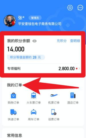 3、在“我的”页面顶部红框区域,可查看积分余额与专项福利,同时在“我的订单”模块中查询购物、快递、车票及酒店等各类订单信息。