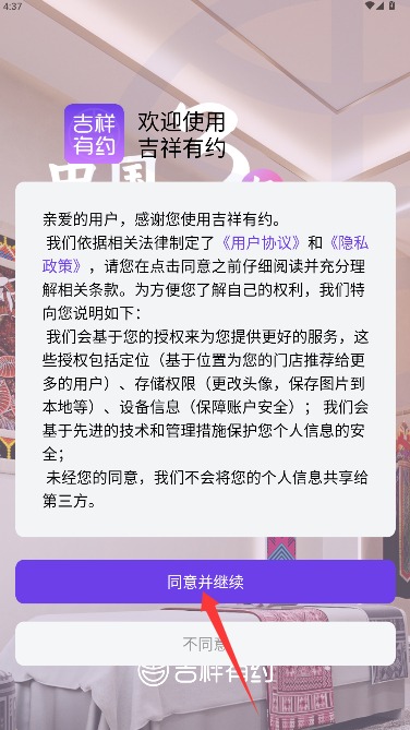 1、打开应用后仔细阅读用户协议和隐私政策,确认后点击同意并继续按钮进入。