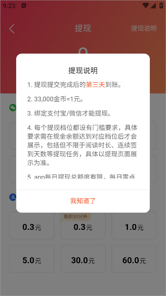 4、注意必须要绑定了渠道方可提现,并且33,000金币=1元,提现第三天方可到账