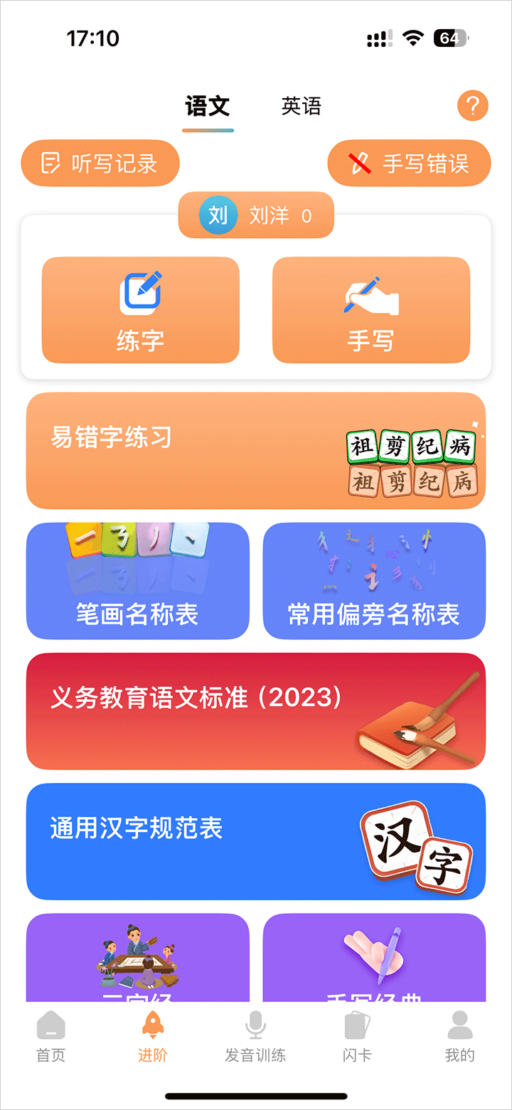 2、在进阶页面可以进行易错字练习等