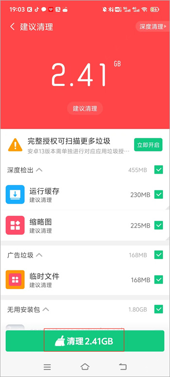 4、然后垃圾扫描出来时候,就可以点击下方的【清除】按键便可以将自己手机中的所有垃圾都清除掉