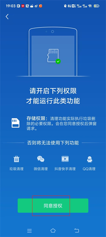 2、随后就会需要让你同意软件的权限管理,可以更加深入的对手机进行清除,点击下面的【同意授权】进行授权