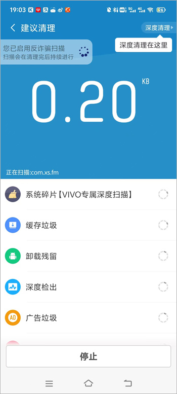 3、然后你的软件便会来到自动扫描的页面中,将所有手机中的垃圾全部都扫描出来,中间可以点击下方的【停止】随时终止自己的清除任务