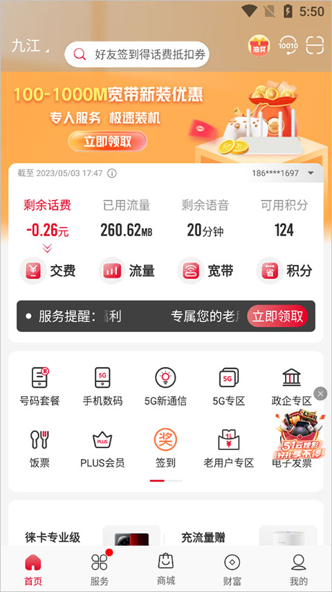 专属内容:存费优惠、宽带测速、套餐专属福利,你的私人定制助理。
