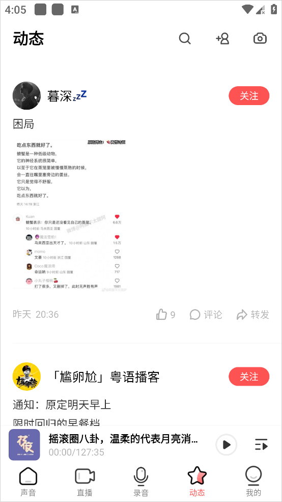 4、【动态】可以查看社区内其他用户发表的评论,也可以关注喜欢的作者,点击右上角可以自己发布动态