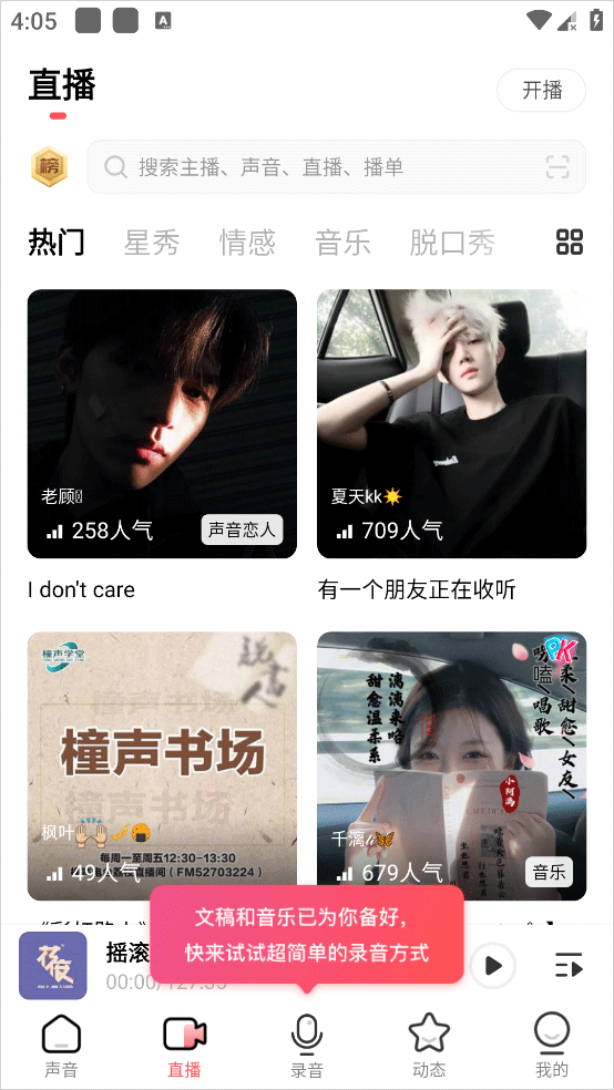 2、【直播】页面有热门的声音直播、聊天室直播等也可以直接搜索主播