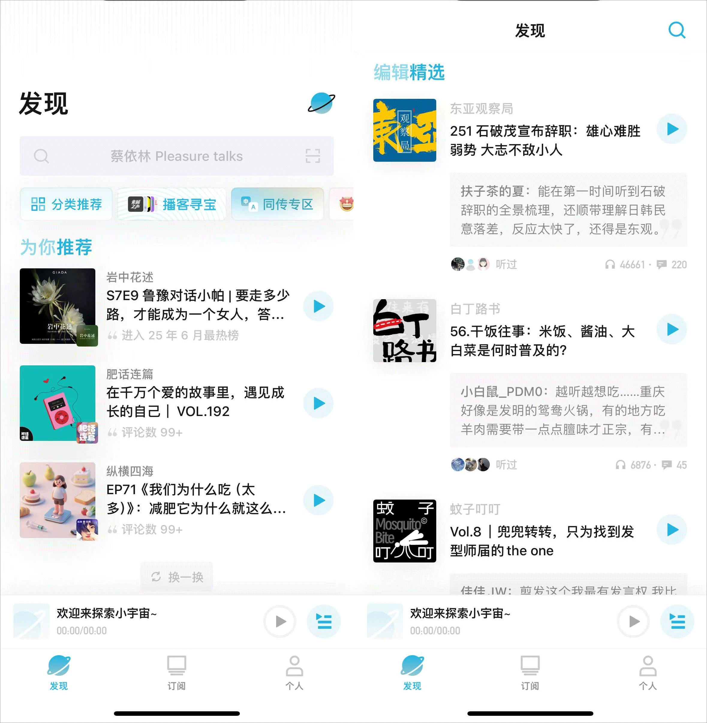 小宇宙app是一款专注播客领域的应用软件,其核心功能包括精准搜索、时间戳互动、收听时长统计及一键导入订阅列表。涵盖了各个领域的主题,包括文化、科技、生活、音乐等。用户可以每天在发现页找到新的播客节目,增加了发现优质内容的机会。小宇宙结合了弹幕和评论的打点笔记功能,用户可以在特定时间点发表感想,方便与其他用户交流。