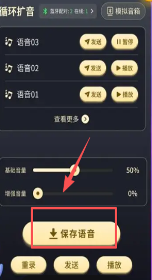 3、进入循环扩音界面,可看到语音文件列表与音量调节滑块,调整参数后点击保存语音按钮,就能存储当前设置。