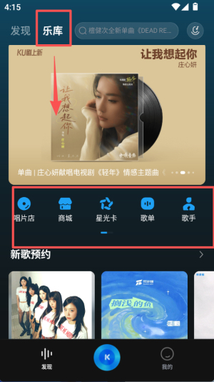 2、切换到 “乐库” 分类,页面顶部展示 KU 剧上新的歌曲宣传图,中间有唱片店、商城等功能入口,下方有新歌预约区域。