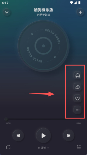 3、进入歌曲播放页面,顶部显示 “酷狗概念版” 标识,中间是唱片样式的播放界面,右侧有耳机、分享等功能按钮。