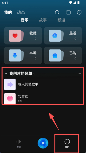 4、打开 “我的” 页面,顶部有音乐、故事等分类,中间有收藏、最近等板块,下方 “我创建的歌单” 区域可管理歌单。