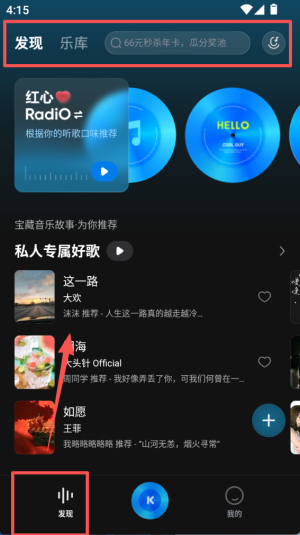 1、进入 “发现” 页面,顶部有搜索栏及 “发现”“乐库” 分类,中间有红心 Radio 推荐板块,下方展示私人专属好歌列表。