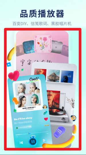 2、点击播放界面可体验百变DIY功能,支持自定义封面、歌词风格和复古黑胶唱片播放效果。
