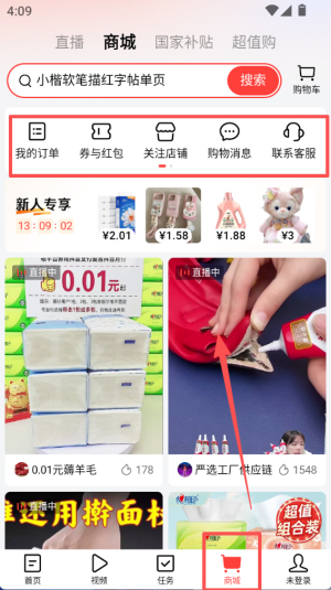3、点击底部 “商城”,页面顶部有直播、商城等分类,中间有搜索栏及我的订单、券与红包等入口,下方展示商品。