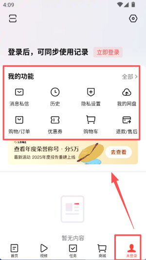 4、再次打开 “未登录” 页面,“我的功能” 区域含购物订单、优惠券等入口,下方有年度荣誉称号的活动提示。
