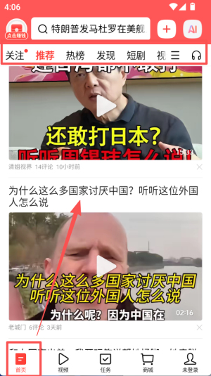 1、点击 “首页”,顶部有搜索栏,中间分类标签可切换,下方展示包含视频的资讯内容,标注了发布账号与时间。