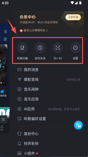 2、在菜单页面中,可看到听歌识曲、定时关闭等功能选项,下方还有我的消息、蝰蛇音效等服务入口。