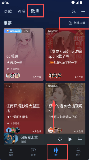 3、进入 “K 歌” 页面并切换到 “歌房”,顶部有创建房间按钮,中间展示音乐 K 歌房、互动交友等歌房列表。