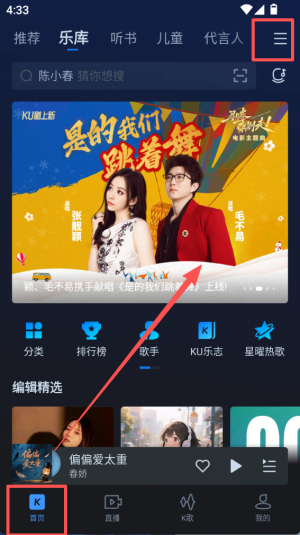 1、回到 “首页” 并点击右上角菜单按钮,页面顶部展示新歌宣传内容,中间有分类、排行榜等功能入口。