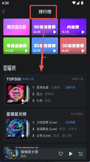 2、点击 “排行榜” 板块,页面呈现腾讯音乐榜、90 后热歌榜等榜单分类,下方还有星曜榜的歌曲排名内容。