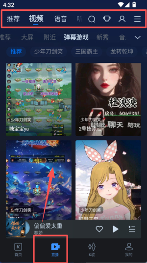 3、切换到 “直播” 页面,顶部可切换推荐、视频等分类,中间展示不同主题的直播内容,包含直播封面与标题。