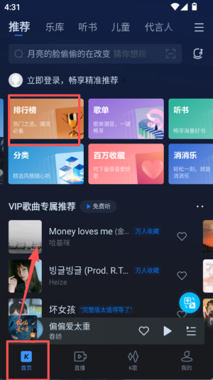 1、进入 “首页” 页面,顶部有搜索栏,中间有 “排行榜”“歌单” 等板块,下方展示 VIP 歌曲专属推荐列表。