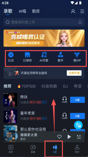 2、点击底部 “K 歌”,页面顶部有录歌、AI 唱等选项,中间有已点、已保存等功能入口,下方展示推荐歌曲。