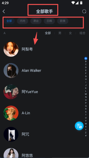 3、进入 “全部歌手” 页面,顶部可按地区筛选歌手,下方按字母排序展示歌手列表,便于查找对应歌手。