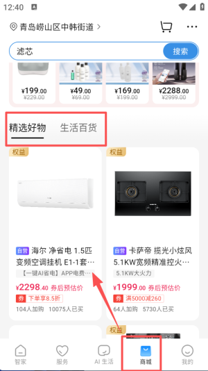 4、进入 “商城” 页面,搜索栏可搜索商品,“精选好物” 板块展示各类家电与生活用品,方便选购所需物品。
