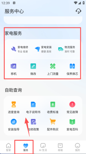 2、点击 “服务” 选项,进入服务中心后,“家电服务” 板块含维修、安装等功能,“自助查询” 可查进度、说明书等。