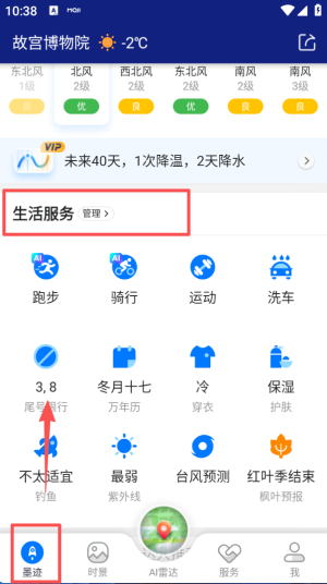 1、回到主界面,“生活服务” 板块包含跑步、骑行等生活建议,还能查看尾号限行、万年历等实用信息。