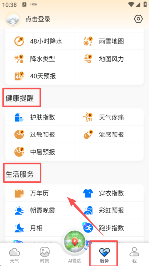 3、切换回 “服务” 页面,“健康提醒” 板块有护肤指数、过敏预报等内容,“生活服务” 里还有穿搭、彩虹预报等功能。