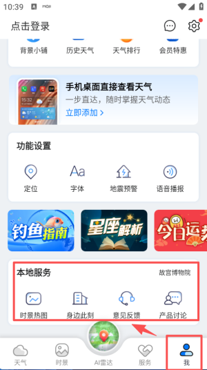4、在 “我的” 页面,“本地服务” 板块包含时景热图、身边利好等入口,可参与意见反馈、产品讨论等互动。