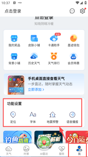 4、进入 “我的” 页面,能看到 “我的奖品”“皮肤小铺” 等功能,还有 “功能设置” 板块可调整定位、字体等配置。