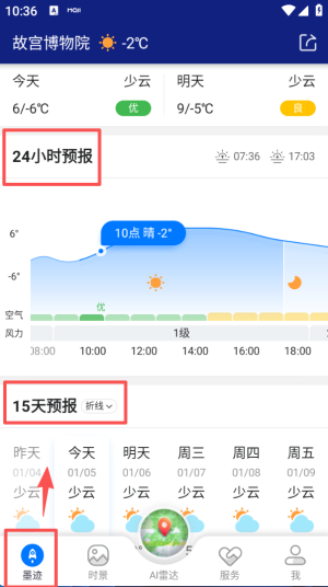 1、进入墨迹天气主界面,能看到 “24 小时预报” 和 “15 天预报” 板块,清晰展示不同时段的天气变化情况。