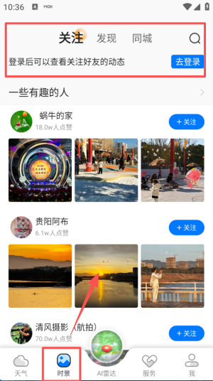 2、点击底部 “时景” 选项,进入时景页面后切换到 “关注” 标签,可查看推荐的有趣用户动态,还能点击关注。