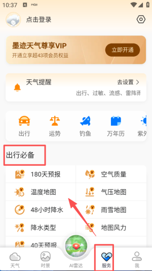 3、切换到 “服务” 页面,“出行必备” 板块下有 180 天预报、空气质量等功能,横向滑动可查看更多服务选项。