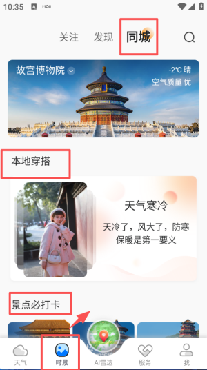 3、在时景页切换到 “同城” 标签,能看到本地相关的时景内容,包含本地穿搭、景点打卡等板块。