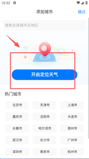 1、进入添加城市页面,点击 “开启定位天气” 按钮,可获取当前定位城市的天气信息,也能选择热门城市添加。