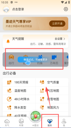 4、进入 “服务” 页面,可看到 “天气提醒” 等功能入口,横向滑动还能查看出行、钓鱼等更多服务选项。