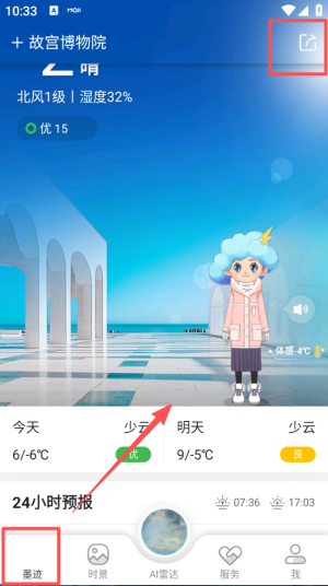 2、回到主界面,点击右上角分享图标,可分享当前天气页面,底部 “时景” 选项可再次进入时景内容页。
